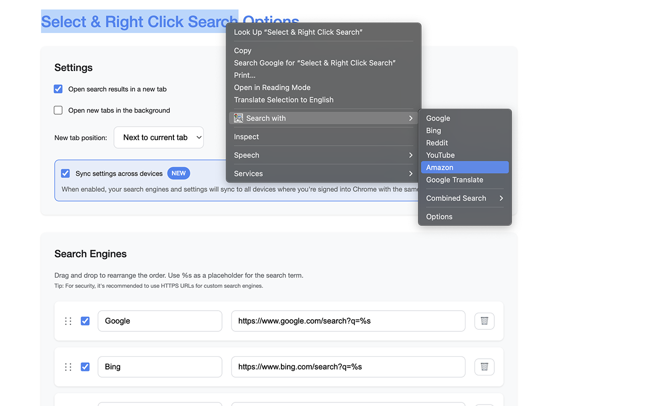 - Multi-Engine Search: Instantly search selected text on Google, Bing, Reddit, YouTube, Amazon, Google Translate, or any custom search engine you add